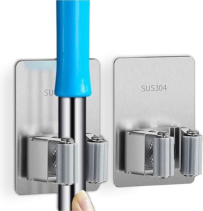 Broom Mop Stainless Wall Mount Holder Self Adhesive Tape, Brush Broom Gripper Holds, Storage Racks & Organization for Your Home, Kitchen Pan, Garage Bathroom Garden Tool Rack No Drilling 2 Pack
