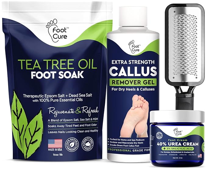 Foot Cure Foot Care/ Exfoliator & Callus Remover Pedicure Set – Includes Foot File for Dead Skin, Tea Tree Oil Foot Soak Salts, Urea Cream 40 Percent & Foot Callus Removal Gel – Made in USA