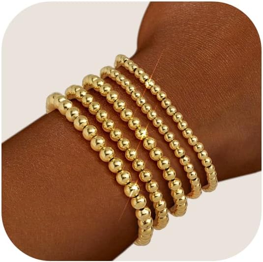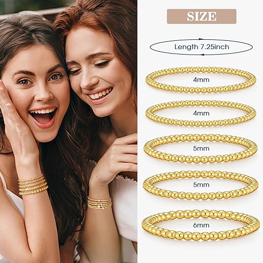 - Stackable Gold Bracelets for Women: Doubgood gold bracelet sets includes 5pcs or 6pcs gold beaded bracelet which stacks well with all bracelets. Gold Beaded Bracelets are a fun way to spice up any outfit, you can mix and match, stack, or go the simple route and only wear one.
