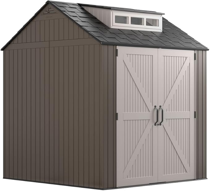 Rubbermaid Large Resin Outdoor Storage Shed With Floor (7 x 7 Ft.), Weather Resistant, Brown, Organization for Home/Lawn Mower/Backyard Equipment/Bike Storage/Pool Supplies