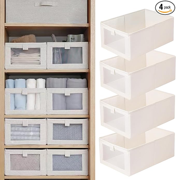 Linen Closet Organizers And Storage, 4 Pack Closet Storage Bins Linen Closet Baskets for Closet Organization Foldable Closet Organizer Bins with Clear Window For Organizing Clothing, Jeans, Shelves