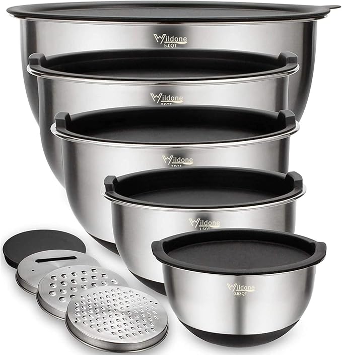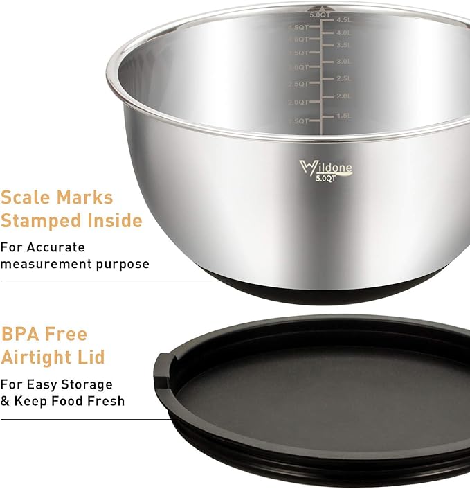 - ALL INCLUSIVE: Wildone set contains 5 piece stainless steel mixing bowls 5, 3, 2, 1.5, 0.63 QT, which allows users to measure, mix, pour and serve food all in one kitchen tool! They come with BPA free airtight lids, 3 grater attachments, silicone non-slip bottoms and measurement marks