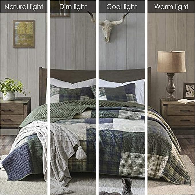 - The cotton quilt and matching shams feature a pieced patchwork design, in green, navy, and taupe hues, that elevates your bedroom with an inviting lodge allure.