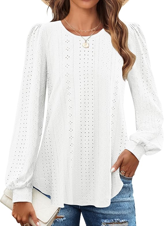 ZESICA Long Sleeve Eyelet Tops for Womens Crew Neck Spring Shirts Casual Loose Blouses Trendy Clothes